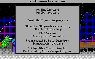 AT THE CARNIVAL is a puzzle game with a carnival theme. It was released in 1989 on DOS and Macintosh platforms and was published by Miles Computing Inc.
