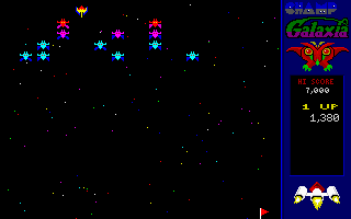 The Galaxia fleet attacks in waves, each one harder than the last. Flags are used to show that a wave has been destroyed. You must pilot the command ships right and left to dodge Galaxia attacks while firing back to destroy the aliens.