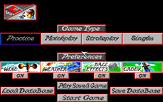 The player is welcomed in first person and is presented with a view of the course in vector based grid lines highlighting the terrain. One can select from the two courses from the main menu along with the 14 clubs from the collection of 17. The computer players have different skill levels based on 5 factors: Fitness, Stance, Grip, Swing and Experience. These computer players can be replaced by created players with set handicaps and up to 50 created players can be stored. The game allows four human or computer players to participate.