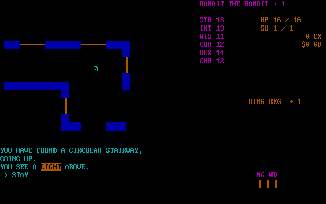 The object of DND is to find the Lord Master of the Heathkit Dungeon. This is done by exploring the 50 level dungeon. You will begin your search on level 1 of the dungeon. At your starting point there will be a roadside tavern. There are other taverns located on level one and it is only at these taverns that you can cash your gold for experience points (EX). These taverns are located only on the first level of the dungeon. Accumulated experience points will allow you to become a higher level character. When you obtain 2000 EX you increase to level 2, 4000 level 3, 8000 level 4 etc. You will see the light of a tavern when you find it.