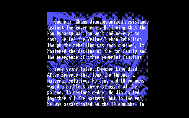 The player takes control of a master, a general capable of commanding as many states as he can acquire, and, if successful, unifies China. As many as eight may play, but only one can succeed. There are five chronologically arranged scenarios. The first has China in its most disorganized period and the last has virtually all of China controlled by one of three generals. The precise requirements for success in each of these scenarios differs, but in all cases the goal is to rule as many states as possible. After the completion of any scenario but number five the game will automatically advance to the next. You may start the game at any scenario.